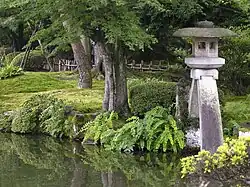 - Kanazawa: Kenroku-en, angelegt auf dem Höhenrücken vor der Burg und von Gewässern durchflossen. Bekannt ist die Yukimi-Steinlaterne „Kotoji“ am Wasser.