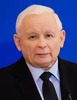 Jarosław Aleksander Kaczyński ( []; * 18. Juni 1949 in Warschau) ist ein polnischer Politiker, Jurist und ehemaliger Aktivist der in Opposition zur kommunistischen Diktatur gegründeten Gewerkschaft Solidarność. Als Vorsitzender der konservativen Partei Zentrumsallianz (1990–1998) und der nationalkonservativen Partei PiS (seit 2003) war er an der Bildung mehrerer polnischer Regierungen beteiligt und von 2006 bis 2007 selbst Ministerpräsident Polens. Von Oktober 2020 bis Juni 2022 sowie vom 21. Juni bis zum 27. November 2023 war er als stellvertretender Ministerpräsident Mitglied im Kabinett Morawiecki II.[1][2] Er gehörte von 1989 bis 1991 dem Senat der Republik Polen sowie von 1991 bis 1993 und erneut seit 1997 dem Sejm in dessen I., III., IV., V., VI., VII., VIII., IX. und X. Wahlperiode an.