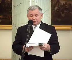 Mit ihm als Spitzenkandidat wurde die von ihm und seinem Zwillingsbruder 2001 gegründete PiS bei der Parlamentswahlen im September 2005 knapp stärkste Kraft und er selbst zum vierten Mal Sejmabgeordneter.[16] Um die Wahlchancen seines Bruders Lech Kaczyński bei der Präsidentschaftswahl im Oktober 2005 nicht zu gefährden, verzichtete Jarosław zunächst darauf, Ministerpräsident zu werden und schlug Marcinkiewicz für dieses Amt vor. Nach gescheiterten Koalitionsgesprächen mit der Bürgerplattform (PO) bildete die PiS unter Marcinkiewicz zunächst eine Minderheitsregierung, die auf eine informelle Unterstützung der Liga polnischer Familien (LPR) sowie der Samoobrona Rzeczpospolitej Polskiej von Andrzej Lepper angewiesen war. Beide Parteien schlossen sich im Mai 2006 der Regierung an, wodurch sie eine Mehrheit bekam. In der Folge ersetzte Kaczyński im Juli 2006 nach parteiinternen Differenzen den in der Bevölkerung beliebt gewordenen Marcinkiewicz als Ministerpräsident.