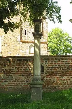 - Toskanische Pestsäule von 1668 steht vor der Friedhofsmauer der Kirche