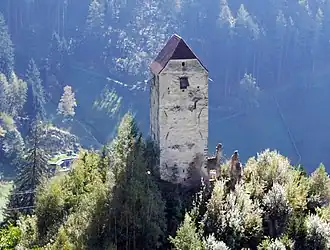 Die Wandmalereien, die sich im vierten Stockwerk des Bergfriedes noch erhalten haben, sind in das 16. Jahrhundert zu datieren und sind einige der wenigen noch erhaltenen Renaissancemalereien in Tirol. Sie werden Bartlmä Dill Riemenschneider, einem Sohn des Tilman Riemenschneider, zugeschrieben.[1] Der Künstler bemalte unter anderem auch den Dreikönigsaltar aus dem Brixner Dom und hinterließ seine Spuren in mehreren Tiroler Schlössern. Die Malereien sind durch Bibelzitate ergänzt; verwunderlich ist dabei, dass es sich teilweise um Zitate aus der Luther-Übersetzung des Bibeltextes handelt, und das obwohl der Auftraggeber für die Malereien ein katholischer Bischof, nämlich Christoph Fuchs von Fuchsberg, war. Erstaunlich ist auch, dass Christoph Fuchs bereits 1538, kurze Zeit nach dem Erscheinen der Lutherbibel, Zugang zu derselben hatte. Am oberen Rand der Malereien befinden sich Wappen verschiedenster zum Teil zugeheirateter Familien, unter anderem auch jenes der Herren Fuchs von Fuchsberg. Im Hauptteil der Malereien erkennt man überwiegend religiöse Motive und auch einige Putten. Im Fensterbogen im Westen spielen drei nackte Putten, das Ostfenster ist mit der Verkündigungsgeschichte ausgemalt. Umrahmt wird alles von einem gemalten Balustrade im unteren Bereich und zwei Scheingesimsen im oberen Bereich, in welche der Maler auch durch mehrere angesetzte Scheren auf seinen Namen hinweist.