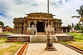 Der um das Jahr 1250 entstandene und größtenteils aus Speckstein erbaute Lakshminarasimha-Tempel gehört zum Drei-Cellae-Typus (trikuta) und ist eine Stiftung des Hoysala-Herrschers Vira Someshvara (reg. 1235–1263); er ist dem Hindu-Gott Vishnu in seiner Form als Narasimha sowie seiner Gemahlin Lakshmi geweiht und ruht auf einer ca. 1 m hohen Umgangsplattform (jagati), die in ihren Dimensionen dem Grundriss des Tempels folgt. Die kleeblattförmig angeordneten Cellae (garbhagrihas) sind durch eine Vorhalle (mandapa) miteinander verbunden. Über der mittleren Cella erhebt sich ein mehrfach gestufter Turm (vimana) mit abschließender ‚Schirmkuppel‘; der ehemals vorhandene Vasenaufsatz (kalasha) ist jedoch verloren. Die Außenwände sind im unteren Teil mehrfach horizontal gegliedert; im oberen Teil finden sich Götter- und Begleitfiguren, darüber kleine Türmchen, die als Hoheitszeichen verstanden werden müssen. Im Innern der durch durchbrochene Steinfenster (jalis) belichteten Vorhalle (mandapa) befinden sich die charakteristischen gedrechselten Speckstein-Säulen der Hoysala-Architektur; die Deckensegmente enthalten teilweise exquisit gearbeitete Kragkuppeln mit herabhängenden Schlusssteinen. Der Tempeleingang sowie der Eingang zur Cella werden flankiert von jeweils zwei lebensgroßen Wächterfiguren (dvarapalas).