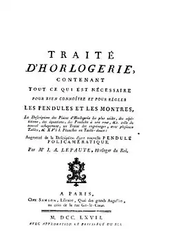 Traité d'Horlogerie, contenant tout ce qui est nécessaire pour bien connoître et pour régler les pendules et les montres, la description des Pièces d'Horlogerie les plus utiles, des répétitions, des équations, des Pendules à une roue, &c. celle du nouvel échpement, un Traité des engrénages. Augmenté de la description d'une nouvelle pendule policamératique.; Paris 1755.[4]