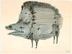 Le sanglier, Gouache, Collection de l'art brut, Lausanne (Schweiz), Jean Vincent de Crozals 1960« Le sanglier », Gouache und Chinatinte, 1960, eines von 15 Werken, welche Jean Dubuffet erworben hat und 1976 dem Schweizer Museum "Collection de l'art brut" in Lausanne geschenkt hat[37].