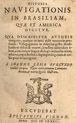 - HISTOIRE D’VN VOYAGE FAIT EN LA TERRE DV BRESIL, AVTREment dite Amerique. Contenant la navigation, & choses remarquables, veués sur mer par l'aucteur: Le comportement de Villegagnon, en ce pais là. Les meurs & façons de viure estranges des Sauuages Ameriquains: auec vn colloque de leur langage. Ensemble la description de plusieurs Animaux, Arbres, Herbes, & autres choses singulieres, & du tout inconues par deça, dont on verra les sommaires des chapitres au commencement du liure. Non encores mis en lumiere, pour les causes contenues en la preface. Le tout recueilli sur les lieux par IEAN DE LERY natif de la Margelle, terre de sainct Sene au Duché de Bourgongne, 1578, Ausgaben von 1578, 1585, 1594 und 1611 auf Gallica.