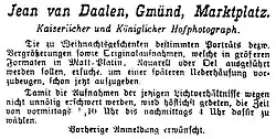 1894 zog Jean van Daalen nach Aalen um. Dort übernahm er die Atelierräume, die ursprünglich von dem Fotografen C. Burghardt erbaut und dann zeitweise von Wilhelm Boppel genutzt wurden.[1] Recht bald danach entschied sich van Daalen, einen Filialbetrieb in Gmünd zu eröffnen. Er einigte sich dazu mit dem Gmünder Flaschnermeister Müller, der im Januar 1897 eine Baugenehmigung für ein Atelier beantragte. Nach wiederholten Beratungen erteilte die Baukommission eine Genehmigung, die jedoch mit verschärften feuerpolizeilichen Auflagen verbunden war. Danach wurde das Hinterhaus des Gebäudes Marktplatz 34, das die Flaschnerwerkstatt beherbergte, um ein Stockwerk erhöht und mit einem Pultdach bedeckt. Dort errichtete man ein etwa 4 m × 9 m großes Atelier nebst Nebenräumen: Wartezimmer, Arbeitszimmer und Dunkelkammer. Die Längswand des Ateliers an der Nordseite sowie das Pultdach wurden großflächig verglast.[5] Die Kosten der Bauarbeiten betrugen nach dem Kostenvoranschlag 10.000 ℳ. Das Atelier wurde am 1. September 1897 eröffnet, was bereits in einer Anzeige am 9. August angekündigt wurde.[1] Das Atelier lief gut und die Erträge waren über die mehr als 20 Jahre seines Bestehens konstant. Nachdem van Daalen es 1920 aufgegeben hatte, blieb es weitgehend ungenutzt. Dadurch, aber auch durch glückliche Umstände, dass das Gebäude nicht zerstört oder abgerissen wurde, ist es komplett bis heute in der ursprünglichen Form erhalten geblieben und ist eines der sehr seltenen gewerbegeschichtlichen Zeugnisse der Fotografie in Deutschland.[5] Um die Jahrhundertwende baute van Daalen seinen Betrieb weiter aus und eröffnete eine weitere Filiale – in Nördlingen; um 1913 kam noch eine hinzu – in Ulm. Es ist eindeutig, dass er nicht überall gleichzeitig anwesend sein konnte und deswegen Fotografen beschäftigte, die er aber umfassend einarbeitete.[6]