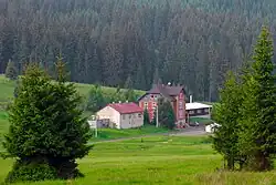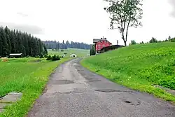 OrtseingangOberer OrtsteilDenkmal an Stelle der KircheVilla im Ortsteil SteingrubGasthaus und PensionVerlauf des Schwarzwassers bei Jelení