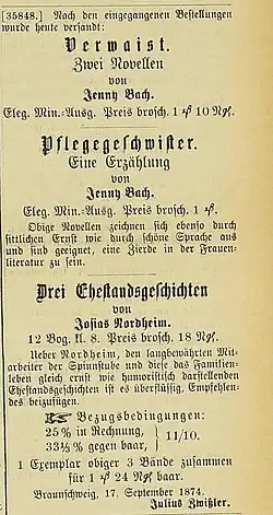 In einer Augsburger Zeitung findet sich Anfang 1875 eine kurze Literaturkritik zur anderen frühen Jenny-Bach-Publikation von 1874, Die Pflegegeschwister.