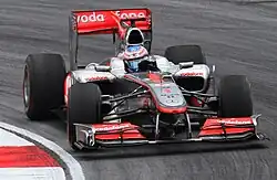 Ende 2009 wurde Button von McLaren für die Saison 2010 als Teamkollege von Lewis Hamilton verpflichtet und erhielt einen Vertrag bis Ende 2011.[20] Nachdem er bei seinem Debütrennen für McLaren den siebten Platz belegt hatte, holte Button beim turbulenten Großen Preis von Australien bereits im zweiten Rennen für McLaren den ersten Sieg. Nach einem weiteren Sieg beim Regenrennen in China, das er vor seinem Teamkollegen Hamilton gewann, übernahm er die Führung in der Weltmeisterschaft, die er für ein weiteres Rennen behielt. Im weiteren Verlauf der Saison entschied Button kein weiteres Rennen für sich. Bei den Rennen in der Türkei und in Kanada kam er auf dem zweiten Platz hinter Hamilton ins Ziel und trug so zu zwei weiteren McLaren-Doppelsiegen bei. Beim letzten europäischen Grand Prix in Italien lag Button über die Hälfte des Rennens in Führung. Er unterlag jedoch Ferrari-Pilot Alonso, der mit einem früheren Boxenstopp den ersten Platz übernahm. Button kam auf dem zweiten Platz ins Ziel. Ein Rennen vor Saisonende stand schließlich endgültig fest, dass Button seinen Weltmeistertitel nicht verteidigen konnte. Mit insgesamt sieben Podest-Platzierungen beendete er die Saison eine Position hinter Hamilton auf dem fünften Platz in der Gesamtwertung.