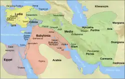- ↑ siehe hierzu auch Liste der Herrscher im 7. Jahrhundert v. Chr., sein Vorgänger Nabopolassar, welcher in einem Bündnis mit den Medern Assyrien besiegt.