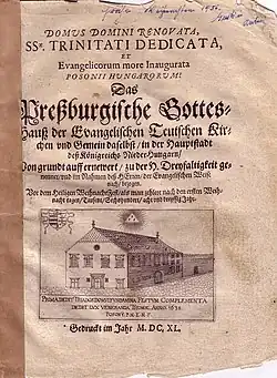 Die Kirche wurde in Form eines evangelischen Bethauses zwischen 1636 und 1638 an Stelle des ehemaligen „Armbruster’schen Hauses“ errichtet. Mit der Bauausführung wurde der aus Augsburg stammende Baumeister Hans Stoss betraut, welcher ein schlichtes Gebäude im Stil der Spät-Renaissance entwarf. Es mussten strenge Baukriterien berücksichtigt werden. Das Gebäude durfte nicht das Aussehen eines sakralen Baus haben und ebenfalls war der Bau eines Kirchturms untersagt. Nach drei Jahren Bauzeit konnte am 18. Dezember 1638 der aus Augsburg stammende Theologe mit internationaler Bedeutung, Josua Wegelin (1604–1640), der Elfte in der Ahnenreihe der Pfarrherren der Deutschen Evangelischen Kirchengemeinde A. B., für das neue Bethaus neben dem Preßburger Rathaus die erste Dankpredigt für die glückliche Vollendung des Kirchenbaues halten. Die feierliche Konsekration erfolgte im Rahmen eines zweitägigen Kirchweihfestes am 21. Dezember 1638. Josua Wegelin der Senior der Gemeinde weihte das Gotteshaus auf dem Namen der Heiligen Dreifaltigkeit und er hielt auch die Festpredigt. Damit hatten die Deutschen Evangelischen Preßburgs einen der Höhenpunkte ihrer Existenz in jener Zeit erreicht. Mit der Konsekration dieses Gotteshauses begann die erste Blütezeit der Preßburger evangelischen Kirchengemeinde. Die Baukosten beliefen sich auf 22.925 Taler.[1]