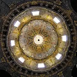 Der Tambour, auf dem die Kuppel aufliegt, weist acht große Fenster auf. Die Wände zwischen den Fenstern sind reich verziert, ebenso wie die Pilaster, die die Felder trennen und auf denen die Kuppel ruht. Die Kuppel hat einen Durchmesser von 20 m und eine Scheitelhöhe von 50 m. Einschließlich der darauf aufgesetzten Laterne beträgt die Gesamthöhe vom Boden sogar 65 m.[13] Die Kuppel ist doppelschalig. Es gibt eine äußere Kuppel aus Kalkstein und eine innere aus Sandstein, der viel weicher und leichter zu bearbeiten war. Zwischen den beiden besteht ein Abstand von einem halben Meter. Carlo Fontana hatte ursprünglich vorgesehen, satt des ringförmigen Schiffs um den Kuppelraum herum einen Kranz von Kapellen anzulegen, deren trennende, dicke Mauern den Schub der großen Kuppel auffangen sollten. Als Martín de Zaldúa beschloss, diese Mauern zwischen den Kapellen nicht auszuführen, um ein kreisförmiges Schiff um den Kuppelraum zu legen, gab das der Kirche mehr Größe. Unter Sebastian de Lecuona wurden die Bögen errichtet, die den Kuppelraum mit dem ringförmig umlaufenden Schiff verbinden und den Tambour mit seinen zweieinhalb Meter dicken Wänden tragen, auf dem die große Kuppel aufliegt. Die Statik der Kuppel aber wurde durch die neue Konstruktion geschwächt. Bereits als die Laterne auf die Kuppel aufgesetzt wurde, erwies die Kuppel sich nicht als stabil und musste durch zwei Eisenbänder an der Basis verstärkt werden. Das abschließende Kreuz wurde am 25. Oktober 1735 auf die Laterne aufgesetzt.[14] Die Kuppel ist innen mit acht königliche Wappen geschmückt.