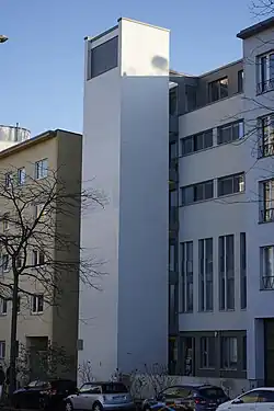 Der Baukörper, ein Stahlbeton-Skelettbau, ist von der Baulinie zurückgesetzt und hat einen rechteckigen, quer zur Straße liegenden Grundriss. Das Schiff der Saalkirche liegt im zweiten Obergeschoss des Gebäudes. Darüber befinden sich zwei Wohngeschosse, die zur Straße Fenster und zum Hof Loggien haben, darunter ist der Jugendraum. Die Rahmen und Balken des Tragwerks im Bereich der Fassade des Kirchenschiffs mit kleinen weißen Keramikfliesen verkleidet. Die übrigen Wandflächen zwischen den Fenstern sind dunkel verputzt.