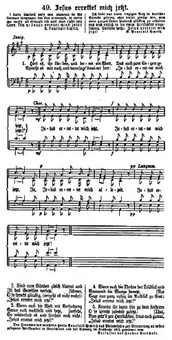 Das Lied Jesus errettet mich jetzt gehört zu den bekanntesten Liedern der Heiligungsbewegung. Es wurde von Ernst Heinrich Gebhardt speziell für Robert Pearsall Smith komponiert.[1] Er stellte es während der Vortragsreihe von Smith am 15. April 1875 in Karlsruhe vor. Man findet es noch in vielen Liederbüchern, vor allem in solchen von Gemeinschaften, die auf die Heiligungsbewegung zurückzuführen bzw. mit deren Lehren verbunden sind.