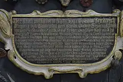 Nach seinem Tod wurde er in der Stiftskirche Halberstadt bestattet. Sein Epitaph wurde hoch oben am nordwestlichen Vierungspfeiler des Domes angebracht.[1] Es handelt sich um eine ovale Holztafel, die mit zahlreichen Wappen und Blumen geschmückt war. Die Schriftkartusche ist noch lesbar, von der Dekoration ging vieles verloren. Heute befindet sich das Epitaph auf der Nordquerhausempore.