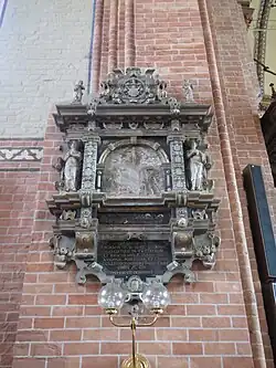 An der Ostwand im nördlichen Querhaus[41] des Güstrower Domes hängt das in verschiedenen Materialien nach niederländischen Vorlagegraphikengen gearbeitete Epitaph des 1588 im Alter von 63 Jahren verstorbenen Hofmarschalls Joachim von der Lühe.[42][43] Das Epitaph stammt aus der Werkstatt des Philipp Brandin und wurde in den 1590er Jahren geschaffen.[44]