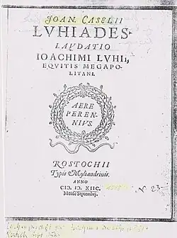 - ↑ Johannes Caselius: JOACHIMI LVHI. Leichenpredigt, Rostock, September 1588.