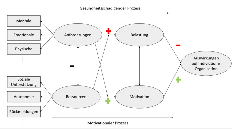 Neben diesen zwei Prozessen geht das Job-Demands-Resources-Modell davon aus, dass es eine Interaktion zwischen Anforderungen und Ressourcen gibt, die für die Entstehung von Gefühlen subjektiver Belastung und Motivation wichtig ist. Es wird davon ausgegangen, dass vorhandene Ressourcen negative Auswirkungen von Anforderungen dämpfen können und dadurch die aus diesen entstehende Belastung reduzieren.[35] Welche spezifischen Ressourcen welche negativen Auswirkungen von Anforderungen dämpfen können, hängt von den individuellen Faktoren eines Unternehmens oder eines Arbeitsbereichs ab.[36]