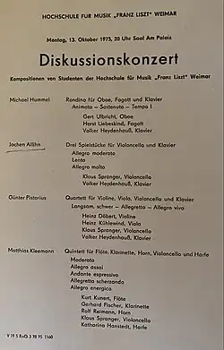 - Drei Spielstücke für Cello und Klavier (1973; aufgeführt im Rahmen eines Diskussionskonzerts am 13. Oktober 1975 an der Hochschule für Musik „Franz Liszt“ Weimar)