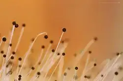 • Die Mucorales sind fast ausschließlich Saprobionten, leben also von totem Material. Zu ihnen gehört auch der Gemeine Brotschimmelpilz (Rhizopus stolonifer), der nicht nur Brot, sondern als Wattefäule auch Früchte wie beispielsweise Erdbeeren befällt, und andere Rhizopus-Arten sowie Mucor-Arten und die Gattung[4] Absidia. Eine besonders interessante Gruppe bilden die Hutwerfer (Pilobolus), die ihre Vermehrungssporen gezielt über zwei Meter weit in Richtung des Sonnenlichtes schießen können und dazu über ein effektives Photorezeptor-System verfügen.