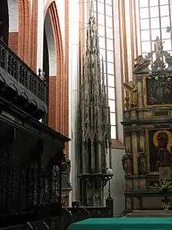 - Sakramentshaus in der Breslauer Elisabethkirche, 1453–1455. Einer der Engel gilt als Selbstporträt des Meisters.