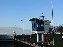 Der alte Turm, von dem die Schleuse bis 2014 bedient wurde, wurde durch einen neuen, auf der südlichen Seite gelegenen Steuerungsturm ersetzt. Von dort aus werden auch die Klappbrücken über den Schleusenkammern sowie die Klappbrücke über den Johan-Friso-Kanal in Warns in etwa 2 km Entfernung ferngesteuert. Im neuen Turm findet sich zudem eine vollständige Kameraüberwachung des gesamten Schleusengeländes, eine Durchsageanlage sowie eine Lichtschranke vor beiden Brücken, die dem Brückenwärter signalisieren, dass eine womöglich knappe Differenz zwischen der Durchfahrtshöhe der Brücke und des Schiffes besteht und dieser die Brücke öffnen sollte. Diese Einrichtung wurde angebracht, da der zweistöckige Turm eine Höhe von knapp acht Metern besitzt und es von dort aus meist nicht möglich ist, zu erkennen, ob die Öffnung der Brücke tatsächlich nötig ist. Wie bei den Hebebrücken der Provinz Friesland, gilt die Regelung des Rijkswaterstaat, dass erst bei mehreren Fahrzeugen eine Durchfahrt ermöglicht wird. Längere Wartezeiten von bis zu zwei Stunden kommen allerdings nur in der Hochsaison zustande, wenn trotz der großen Kapazität eine Überlastung vorliegt.