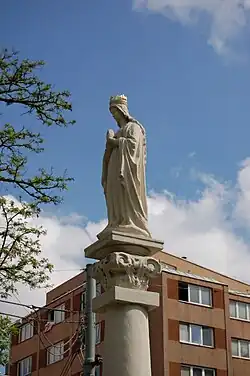 Die Mariensäule ist eine barocke Rundsäule mit Blattrankenkapitell auf Stufensockel und einer Immaculata-Statue aus Sandstein. Sie wurde 1892 an ihren heutigen Platz versetzt.[3][4]