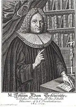 - Andreas Würfel, Karl Christian Hirsch, Christoph Melchior Roth: Lebensbeschreibungen aller Herren Geistlichen, welche in der Reichs-Stadt Nürnberg, seit der Reformation Lutheri, gedienet: benebst einer Beschreibung aller Kirchen und Capellen daselbst. Diptycha Ecclesiae Sebaldinae das ist: Verzeichnüß und Lebensbeschreibungen der Herren Prediger, Herren Schaffer und Herren Diaconorum, welche seit der gesegneten Reformation biß hieher, an der Haupt- und Pfarr-Kirche bey St. Sebald in Nürnberg gedienet haben. Roth 1756, Band 1, S. 76 (books.google.de)