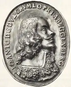 Johann Anton I. von Eggenberg (* 5. Februar 1610;[1] † 19. Februar 1649 in Laibach (heute Ljubljana in Slowenien)) folgte auf seinen Vater Hans Ulrich von Eggenberg als 2. Reichsfürst von Eggenberg und 2. Herzog von Krumau in Südböhmen (1634–1649). Er wurde 1647 gefürsteter Graf von Gradisca (heute in der Region Friaul-Julisch Venetien in Italien) und Herr von Aquileja (Friaul-Julisch Venetien), war Graf zu Adelsberg (heute Slowenien), sowie Besitzer zahlreicher Herrschaften und Schlösser in der Steiermark, Nieder- und Oberösterreich und im heutigen Slowenien. Im Jahr 1644 wurde er Ritter des Ordens vom Goldenen Vlies. Anders als sein Vater strebte er keine hohen Regierungsfunktionen an, sondern widmete sich seinen ausgedehnten Besitzungen und primär der definitiven Verankerung seiner Familie im neu erworbenen Reichsfürstenstand. Dies, indem er sich 1639 mit einer Markgräfin von Brandenburg vermählte, den Bau von Schloss Eggenberg (nunmehr im XIV. Stadtbezirk – Eggenberg) bei Graz vorantrieb und zwecks Erhalt der Reichsstandschaft 1641 die Belehnung mit der reichsunmittelbaren gefürsteten Grafschaft Gradisca erlangte. Trotz aller Bemühungen konnte er nicht mehr die Zulassung zu Sitz und Stimme im Reichsfürstenrat erlangen, da er vorzeitig – mit nur 39 Jahren – verstarb.