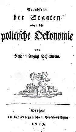 - ↑ Diethelm Klippel: Johann August Schlettwein and the economic faculty at the University of Giessen, Abstract auf philpapers.org, abgerufen am 28. August 2014.