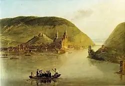 - „Rüdesheim am Rhein, Ruinen der Brömserburg mit Blick auf Bingen“, um 1820; Aquarell.