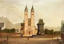 - „Rheinufer bei Urmitz mit der Pfarrkirche St. Georg“, 1848; Öl auf Holz, 33 × 43 cm (Abbildung: online).