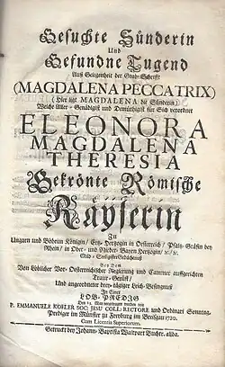 - Kofler, Emanuel: Gesuchte Sünderin und gefundene Tugend : Eine Leichpredigt auf Elenora Magd. Ther. Röm. Kais. Pfalzgräf. b. Rhein, Freiburg i. Br., 1719