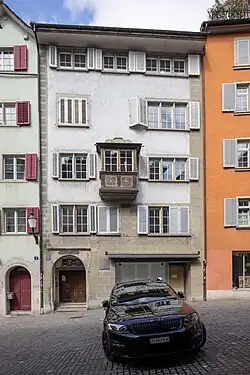 Johann Caspar Lavater wurde 1741 als Sohn eines angesehenen Arztes im elterlichen Haus an der Spiegelgasse 11 (Lage) in Zürich geboren.[1] Der Arzt und Apotheker Diethelm Lavater war sein jüngerer Bruder. Die Lavater waren im 17. und 18. Jh. sehr stark im Zürcher Rat vertreten. Sie stellten 47 Grossräte und 17 Kleinräte sowie 13 Landvögte (neun davon im 18. Jh.). Johann Caspar Lavater besuchte zuerst die Deutsche Schule, dann die Lateinschule, ab 1754 zum Theologiestudium das Collegium Humanitatis und von 1756 bis 1762 das Collegium Carolinum in Zürich, wo u. a. Johann Jacob Bodmer und Johann Jakob Breitinger seine Lehrer waren. 1762 wurde er ordiniert. Im selben Jahr machten er und der spätere Maler Johann Heinrich Füssli mit einer Schrift auf das ungerechte Treiben des ehemaligen Landvogts Felix Grebel aufmerksam.