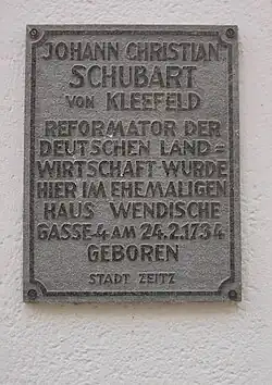 - Adolf Schmiedecke: Johann Christian Schubart, Edler von Kleefeld. Ein bedeutender Förderer der Landwirtschaft und der Bauernbefreiung. Zeitz 1956 (m. Bild u. Schriftenverzeichnis).