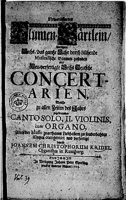 - ↑ a b c d Armin Schmid: Johann Christoph Kridel (Rumburg 1672–1733) und seine Kantaten-Sammlung Neu-eröffnetes Blumen-Gärtlein (Bautzen 1706). In: Hans-Günter Ottenberg, Reiner Zimmenmann (Hrsg.): Musiker-Migration und Musik-Transfer zwischen Böhmen und Sachsen im 18. Jahrhundert: Bericht über das Internationale Symposium vom 7. bis 9. November 2008. Saechsische Landesbibliothek - Staats- und Universitaetsbibliothek Dresden: Institut zur Erforschung und Erschließung der Alten Musik in Dresden, Dresden 2012, S. 15–27 (archive.org [PDF; abgerufen am 27. Januar 2025]).