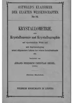 - ↑ Johann Friedrich Christian Hessel: Krystallometrie, oder Krystallonomie und Krystallographie, auf eigenthümliche Weise und mit Zugrundelegung neuer allgemeiner Lehren der reinen Gestaltenkunde, sowie mit vollständiger Berücksichtigung der wichtigsten Arbeiten und Methoden anderer Krystallographen. Bändchen 2 (= Oswalds's Klassiker der exakten Wissenschaften. Band 89). Wilhelm Engelmann, Leipzig 1897.