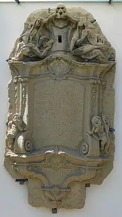 Die Grabplatte für Johann Friedrich II. Göler von Ravensburg befindet sich an der evangelischen Kirche in Sulzfeld: Sie zeigt allegorische Figuren.