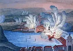 Während die Armée d’Helvétie in Graubünden stand, wurde die Armée du Danube unter Jourdan bei Stockach am 25. März[115] von Erzherzog Karl geschlagen und flutete über den Rhein zurück. In dieser kritischen Situation bot die Helvetische Republik zum Schutz ihrer Nordostgrenze 20'000 Mann Miliz unter den Generalinspektoren auf. Am 4. April wurde Salis dieses Amt auch im Kanton Schaffhausen anvertraut. Er sollte namentlich die Grubenmann-Brücke zwischen Schaffhausen und Feuerthalen verteidigen (die aber von den Franzosen bei ihrem Rückzug in Brand geschossen wurde). Am 5. April erklärte das Direktorium, «daß der Regierungsstatthalter, der Generalinspektor, die öffentlichen Gewalten, und die Militz des Kantons Zürich, sich um das Vaterland wohl verdient gemacht haben».[116] Gleichentags ernannte es Salis zum Generaladjutanten (Dienstgrad) und anstelle von Louis La Harpe zum Generalstabschef der helvetischen Armee.[117]