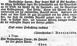 So stellte Bonaparte dem Veltin schliesslich frei, sich der neugeschaffenen Cisalpinische Republik mit den bis dahin österreichischen bzw. venezianischen Wirtschaftszentren Mailand, Bergamo und Brescia anzuschliessen. Das cisalpinische Vollziehungsdirektorium verfügte darauf die Einverleibung der Talschaft, was nach Rufer[97] einer «schweren Vergewaltigung» gleichkam.[98] Dies kostete Bünden 90'000 seiner 160'000 Einwohner.[99]