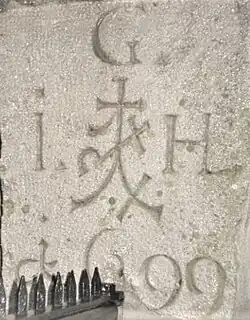Das Steinmetzzeichen von Meister Haresleben ist auf dem Kaisersteinbrucher Ortsstein des Bildhauers Alexandru Ciutureanu eingemeißelt.