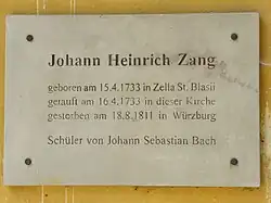 Johann Heinrich Zang (* 15. April 1733 in Zella St. Blasii; † 18. August 1811 in Würzburg) war über 50 Jahre lang Kantor in Mainstockheim bei Kitzingen.
