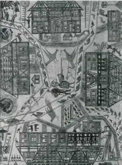 - Ohne Titel (Gutshof), Bleistift, Fettkreiden, Deckfarbe auf Aktenpapier[10]