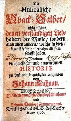 Nachdem die literarische Gattung des satirischen Romans zu dieser Zeit beliebt war, verfasste der vielseitige Kuhnau die Schrift Der Musicalische Quack-Salber, in der er die gesellschaftlichen Zustände am Ende des 17. Jahrhunderts aufs Korn nimmt. Er zeigt hier auch seine Vorstellung vom „wahren Virtuosen“, der sich hauptsächlich durch seine Fähigkeit zur Improvisation auszeichnet.[5][6][7][8][9][10] Diese von der heutigen Vorstellung des Virtuosen abweichende Anschauung war im 18. Jahrhundert weit verbreitet und ist auf ähnliche Weise auch bei Andreas Werckmeister, Lorenz Christoph Mizler und Ludwig van Beethoven zu finden.[11] Dagegen sind die Musikerromane Kuhnaus ganz im Stil von Christian Weise verfasst und gelten als Musterbeispiele einer „aufgeklärten“ realistischen Darstellungsweise. Von den musiktheoretischen Schriften sind nur wenige erhalten geblieben. Überliefert sind beispielsweise die Vorreden zu den Kantatentexten des Jahrgangs 1709/1710; aus ihnen geht hervor, dass Kuhnau zum einen auf eine gute Auswahl und Zusammenstellung der Texte achtete und zum anderen auch größte Sorgfalt auf die Anwendung der kompositorischen Mittel anwandte. Dabei hielt er sich streng an die von Marco Scacchi begründete Stillehre, die hauptsächlich in der zweiten Hälfte des 17. Jahrhunderts galt und eine scharfe Trennung der einzelnen Stile vorsah.