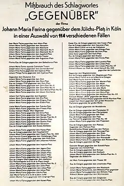 - ↑ Zur Feier des 200 jährigen Geschäfts-Jubiläums der Firma – Johann Maria Farina gegenüber dem Jülichs-Platz. S. 21.