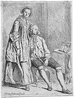 Kaross-Coupé, Radierung von Johann Wilhelm Meil, 1755 nach dem Entwurf von Hoppenhaupt d. Ä., 1745. Eine ähnliche Kutsche schenkte Friedrich II. 1746 der russischen Zarin Elisabeth. -