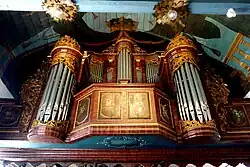 - Foto des von Geycke gebauten Spieltisches in der Hauptkirche Sankt Jacobi