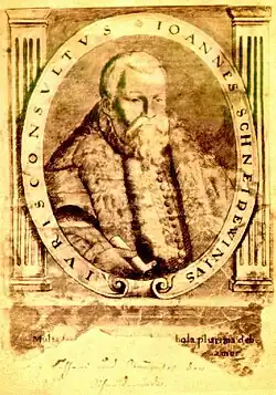 - So. Johann Schneidewein (* ± 1541 in Wittenberg; † 19. November 1617, begr. 23. November 1617 in Zwickau) immatr. 2. Mai 1558 Uni. Wittenberg, Protonotar und Sekretär des Oberkonsistoriums in Dresden & Zwickau, verh. 27. Januar 1568 in Wittenberg mit Agnes Milich, der Tochter des Prof. Dr. med Jakob Milich
