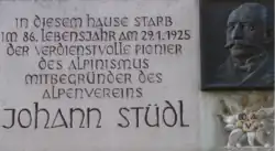 - ↑ Tod des hervorragenden Alpinisten Johann Stüdl. In: Neue Freie Presse, Morgenblatt, Nr. 21689/1925, 30. Jänner 1925, S. 6 Mitte (online bei ANNO).