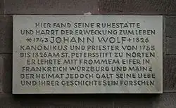 Johann Wolf trat als Novize 1759 in das Heiligenstädter Jesuitenkolleg ein. In weiteren Jahren wirkte er an verschiedenen elsässischen Jesuitenkollegen und kehrte schließlich nach Heiligenstadt zurück. Hier erlebte er die Auflösung des Jesuitenordens durch Papst Clemens XIV. Vom Mainzer Erzbischof erhielt er 1785 ein Kanonikat in Nörten, in welchem er bis zu seinem Tod wirkte. Diese Sinekure erlaubte es ihm, viel Zeit für heimatgeschichtliche Arbeiten aufzuwenden.[3] Zu seinem Verdienst zählt bei seinen Forschungen der Rückgriff auf Urkunden, um auf diese Weise zu seiner objektiven Geschichtsschreibung zu kommen. Von protestantischer Seite wurde dagegen die Kritik laut, er schriebe als Katholik und ging zu sehr von den Mainzer Quellen aus. Wolf wirkte hauptsächlich im Eichsfeld und gilt als Begründer der eichsfeldischen Geschichtsschreibung.